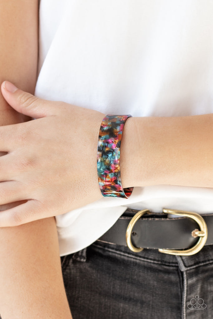Featuring metallic-like shimmer, a speckled acrylic cuff waves across the wrist for a colorfully retro look.