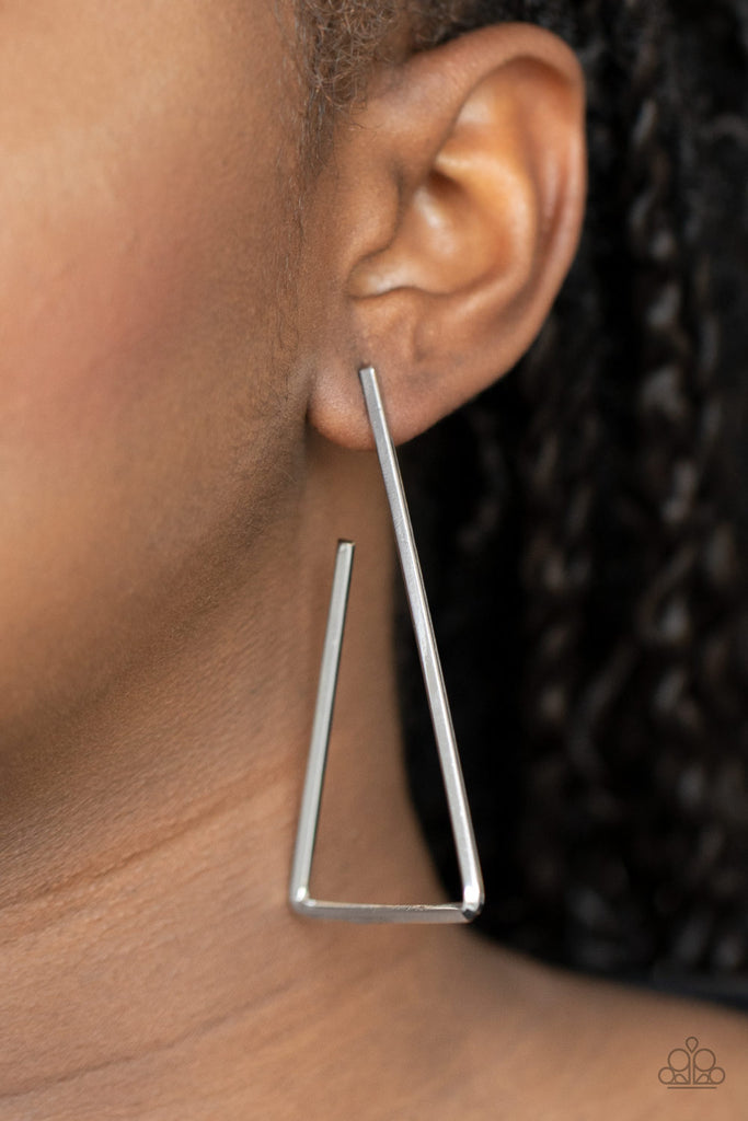 A glistening silver bar sharply bends into an airy triangular frame for an edgy geometric look. Earring attaches to a standard post fitting. Hoop measures approximately 2" in diameter.