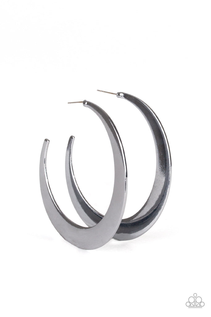 Brushed in a high-sheen finish, a flat gunmetal hoop curls into a bold crescent-like shape for an edgy look. Earring attaches to a standard post fitting. Hoop measures approximately 2 1/2" in diameter.