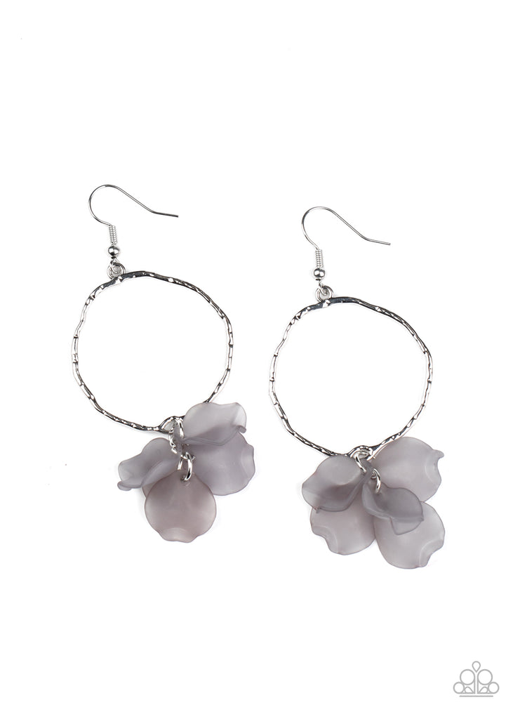 A cluster of Sleet acrylic petals delicately swings from the bottom of a hammered asymmetrical hoop, creating a colorful lure. Earring attaches to a standard fishhook fitting.