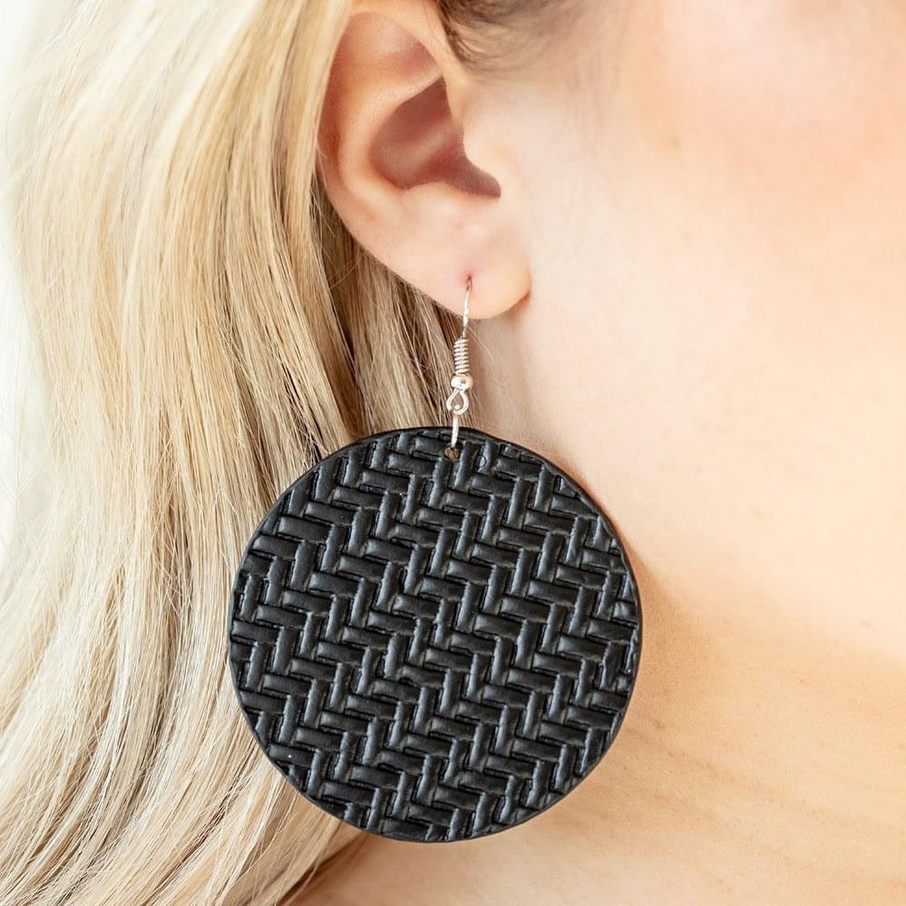 Black leather-like laces weave into a plaited frame for a seasonal flair. Earring attaches to a standard fishhook fitting.