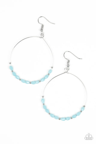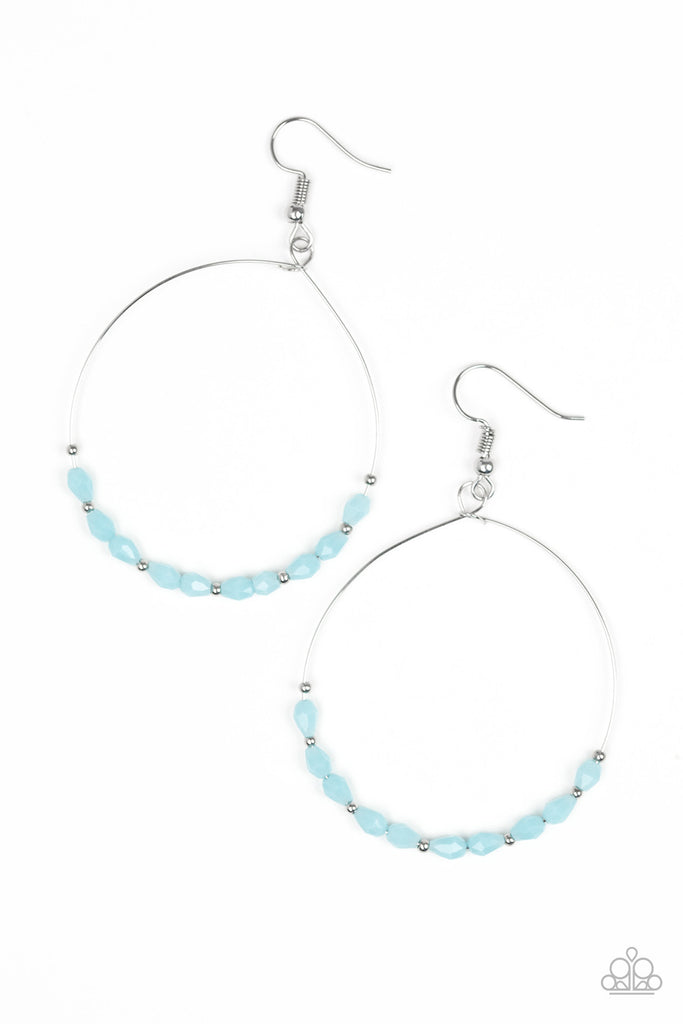 Dainty silver beads and faceted opaque blue beads are threaded along a dainty silver wire, creating a colorful hoop. Earring attaches to a standard fishhook fitting.