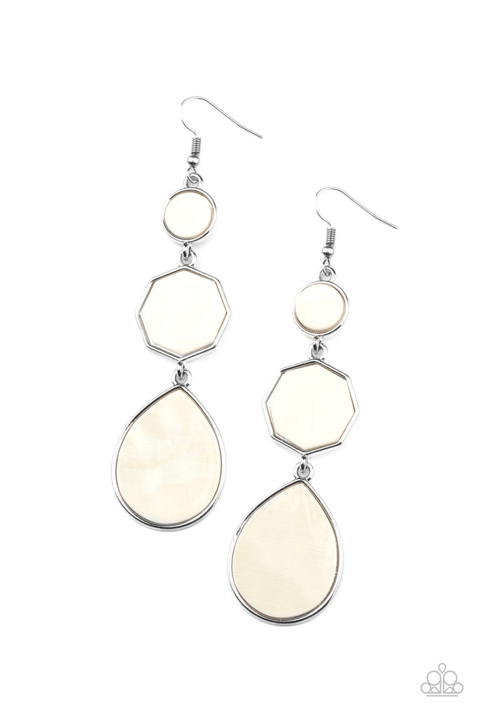 Featuring sleek silver fittings, a dainty collection of round, octagon, and teardrop shell-like frames link into a sleek lure. Earring attaches to a standard fishhook fitting.