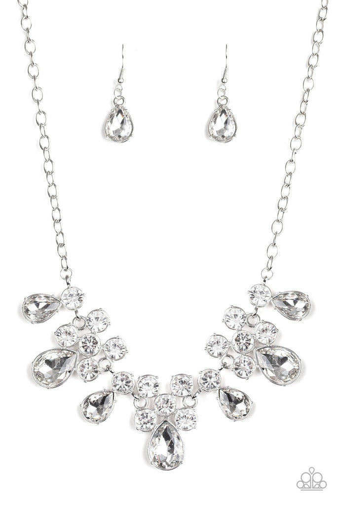A collection of round and teardrop white rhinestones coalesce into dazzling frames as they link below the collar, creating a glamorous fringe. Features an adjustable clasp closure.