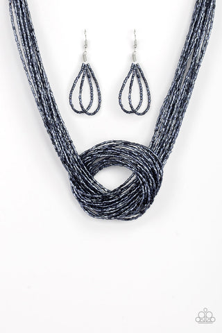 Countless strands of metallic blue seed beads delicately knot together below the collar to create an unforgettable statement piece. Features an adjustable clasp closure.