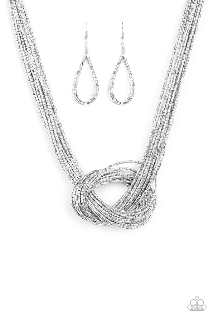 Countless strands of silver seed beads delicately knot together below the collar to create an unforgettable statement piece. Features an adjustable clasp closure.