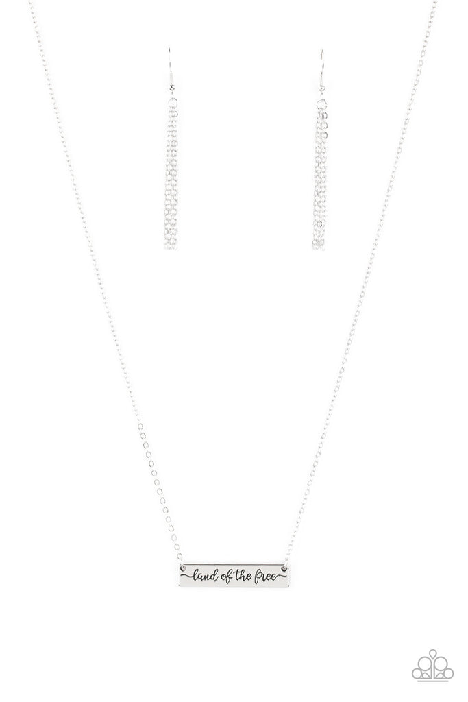 Stamped in the phrase, "Land of the free," a silver rectangular frame is suspended by a dainty silver chain below the collar for a patriotic inspired look. Features an adjustable clasp closure.