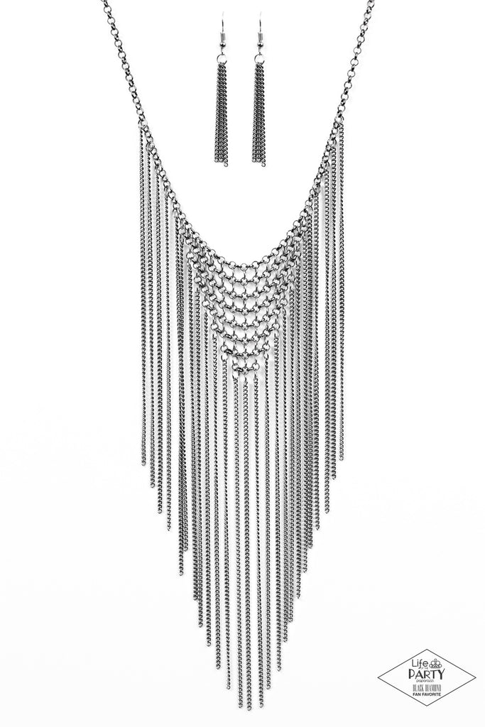 Gunmetal links join into a triangular mesh centerpiece below the collar. Dainty gunmetal chains stream from the bottom of the mesh, shaping into an edgy tapered fringe for a bold industrial look. Features an adjustable clasp closure.