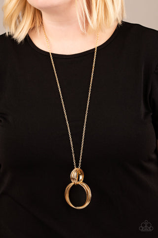 A collection of large and small shiny gold rings interlock into a bold pendant at the bottom of a lengthened gold chain. Features an adjustable clasp closure.