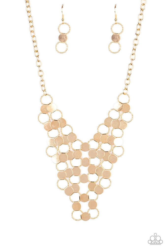 An interlocking net of textured gold rings and reflective gold discs link into a dramatically netted fringe below the collar. Features an adjustable clasp closure.