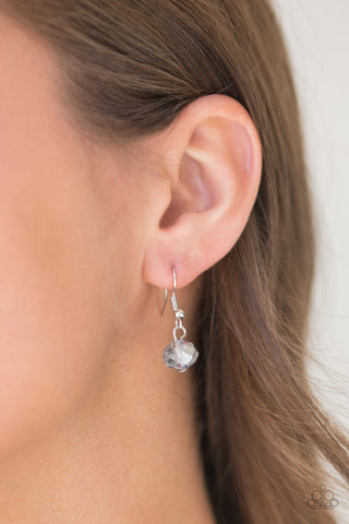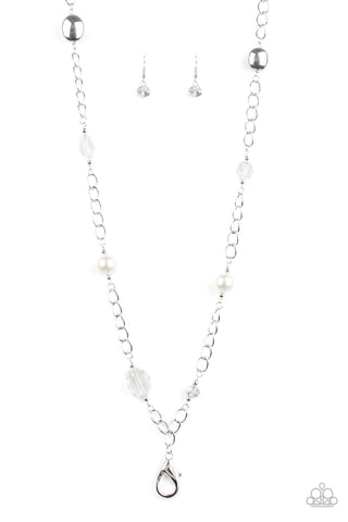 A collection of crystal-like, shiny silver, and pearly white beads trickle down a shimmery silver chain for a refined flair. A lobster clasp hangs from the bottom of the design to allow a name badge or other item to be attached. Features an adjustable clasp closure.