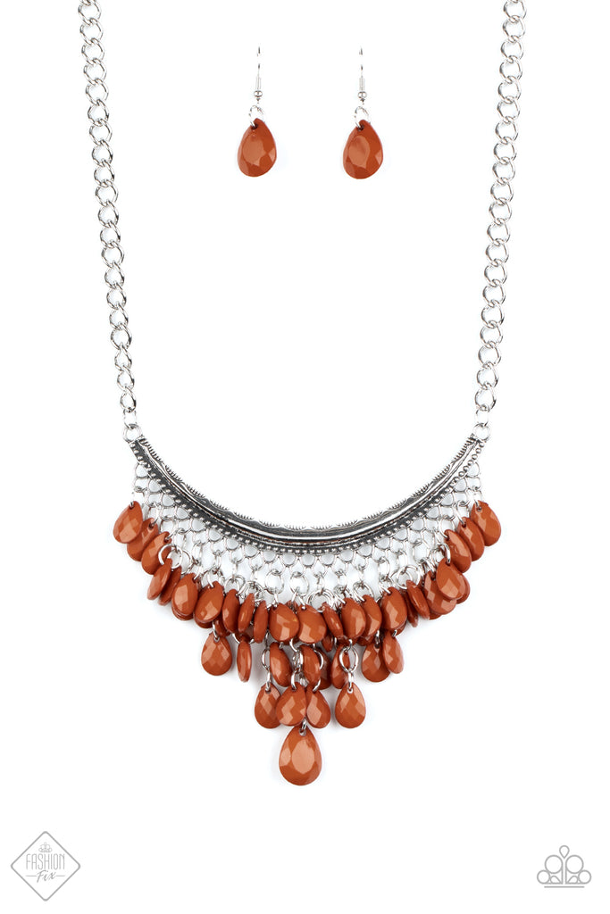 Varying in size, Cinnamon Stick teardrops drip from the bottom of a bowing silver bar, creating an effervescent fringe below the collar. Features an adjustable clasp closure.
