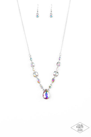 Featuring regal marquise style cuts, glittery iridescent rhinestones trickle along a shimmery silver chain below the collar. A dramatic teardrop rhinestone drips from the center, creating a breathtaking pendant. Features an adjustable clasp closure.