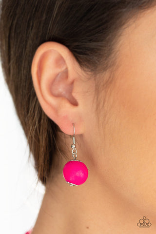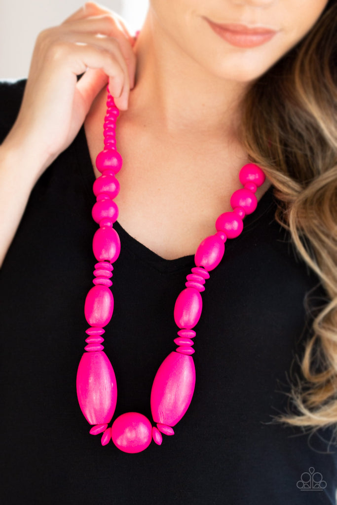 A variety of vivacious pink wooden beads are threaded along a brown string draped across the chest for a summery flair.