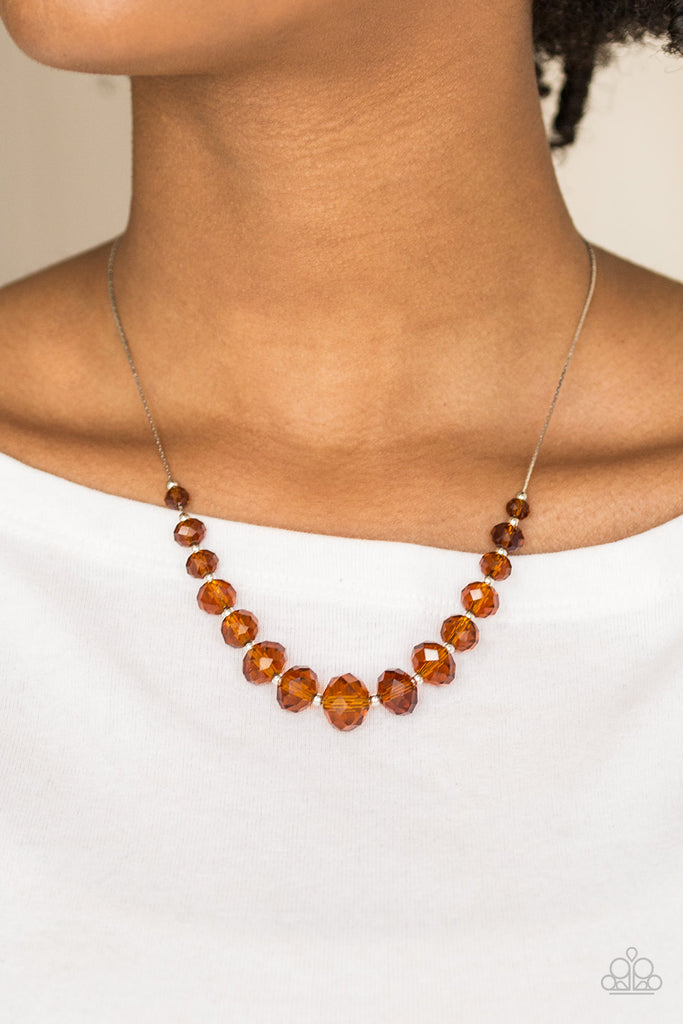 Glittery brown crystal-like beads and dainty silver beads are threaded along a flat silver chain below the collar. The sparkling crystal-like beads gradually increase in size near the center for a refined finish. Features an adjustable clasp closure.