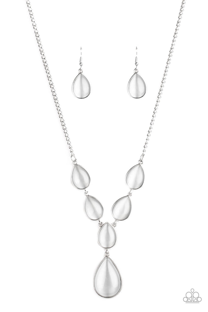 A series of white cat's eye teardrops interlock at the bottom of a silver chain, giving way to an oversized teardrop pendant for a refined finish. Features an adjustable clasp closure.