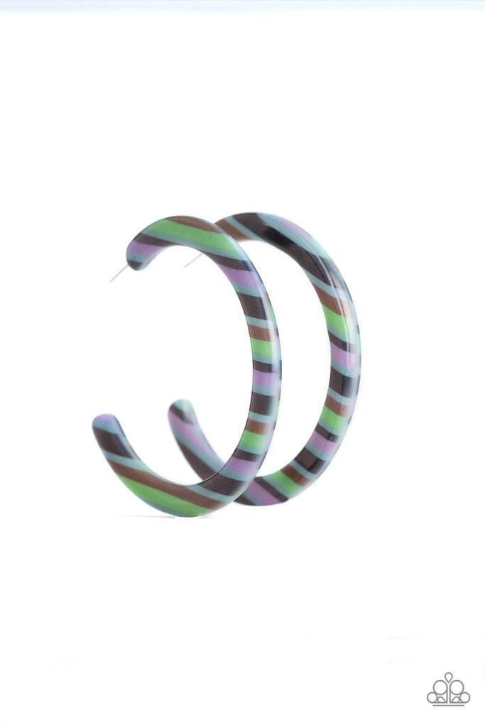 Streaked with colorful accents, a striped acrylic hoop curls around the ear for a retro look. Earring attaches to a standard post fitting. Hoop measures approximately 2 1/2" in diameter.