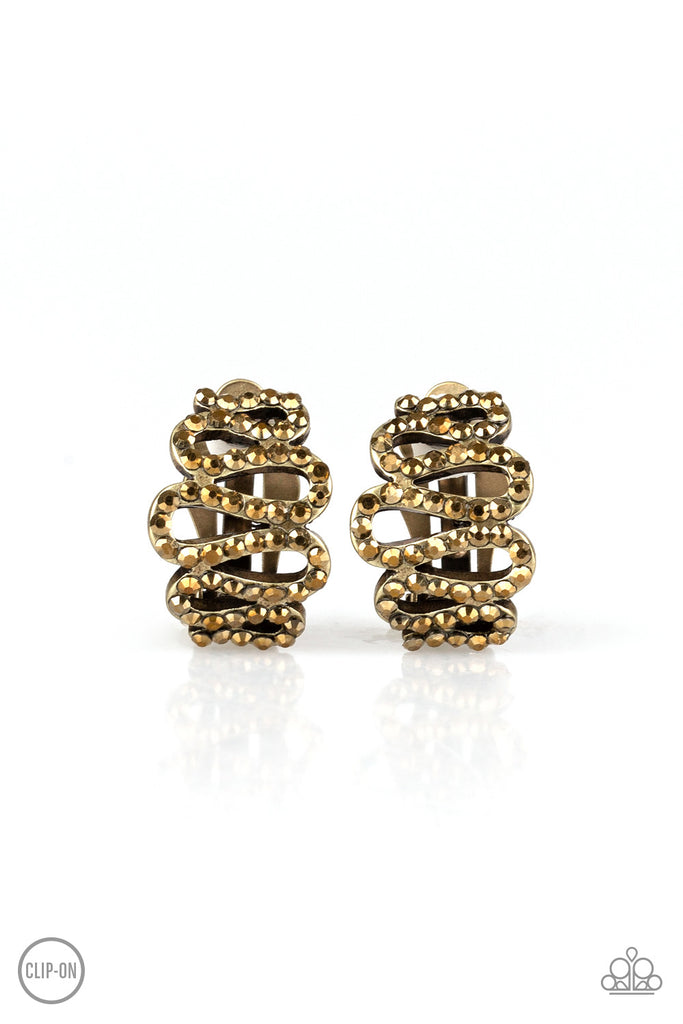 Encrusted in glittery aurum rhinestones, a ribbon of glistening brass loops into a sparkling frame for an edgy look. Earring attaches to a standard clip-on fitting.