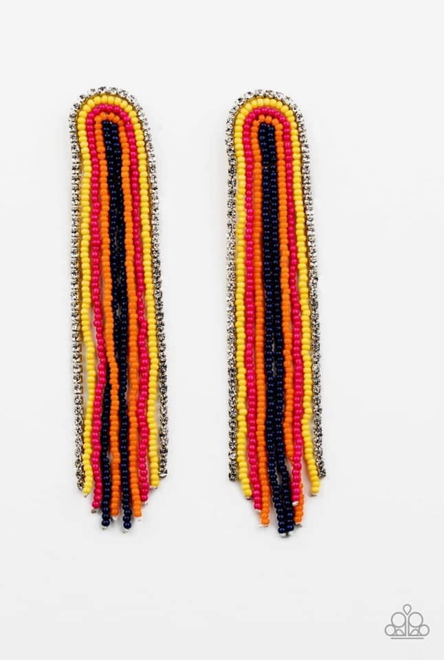 Mismatched strands of yellow, Pink Peacock, Amberglow, Blue Depths seed beads and a glittery strand of white rhinestones delicately curls into a beaded rainbow-like tassel. Earring attaches to a standard post fitting.