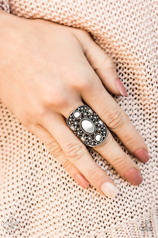 Dotted in an array of studded textures, an oval silver frame folds boldly around the finger. Features a stretchy band for a flexible fit.