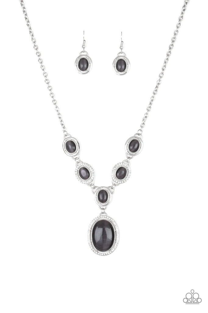 Featuring glistening white rhinestone encrusted frames, black oval cat's eye stones link below the collar. A larger cat's eye stone frame swings from the bottom, creating a whimsical extended pendant. Features an adjustable clasp closure.