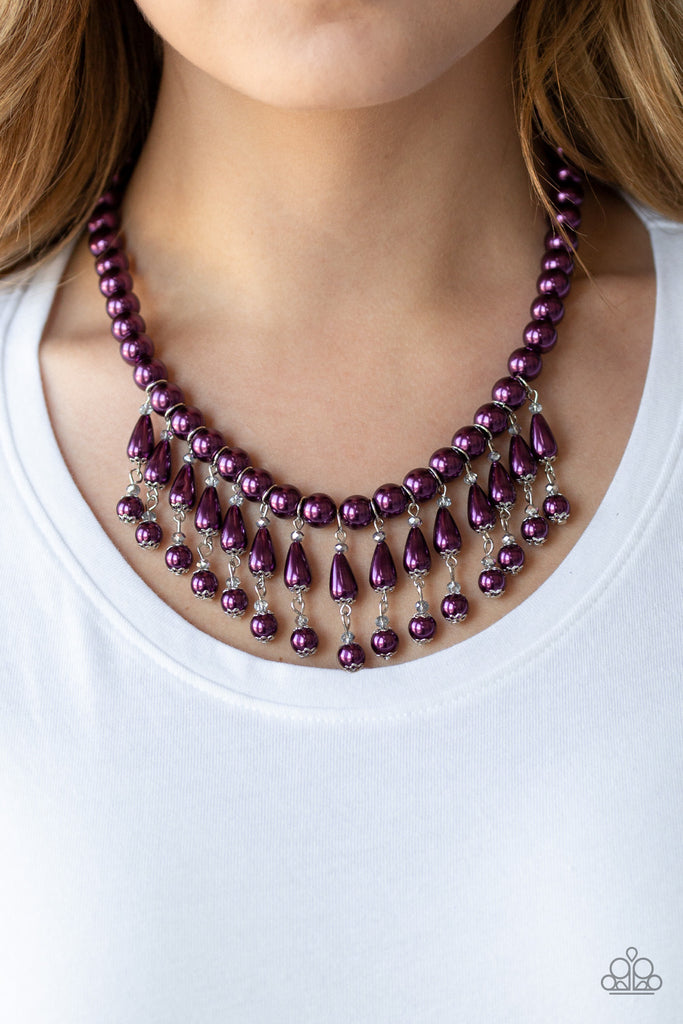 Pearly purple teardrop beads link with classic purple pearls as they drip from a timeless strand of purple pearls. Sprinkled with dainty crystal-like accents, the refined fringe cascades below the collar for a glamorous finish. Features an adjustable clasp closure.