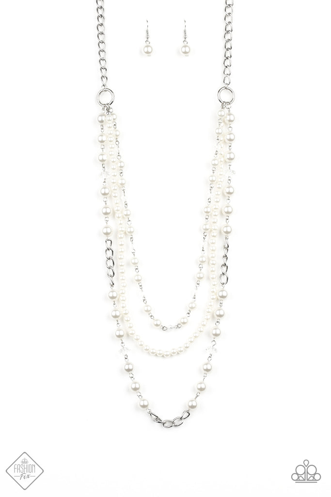 Two glistening silver rings give way to three mismatched strands of pearly white beads and glittery white crystal-like beads that layer down the chest in a refined finish. Features an adjustable clasp closure.