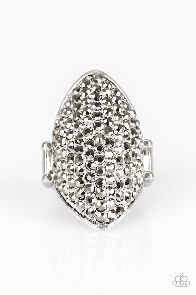 Encrusted in row after row of glittery hematite rhinestones, a dramatic silver frame folds around the finger for a statement-making finish. Features a stretchy band for a flexible fit.