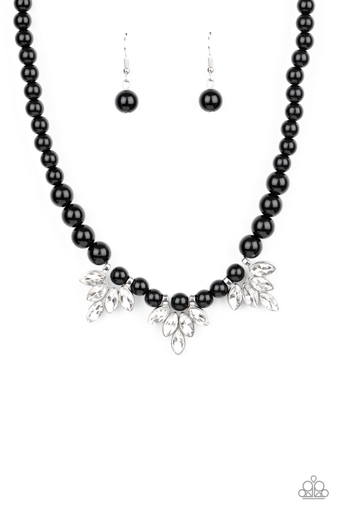 A strand of shiny black beads drapes elegantly below the collar. Featuring regal marquise style cuts, glittery white rhinestone frames swing from the beaded strand for a timeless finish. Features an adjustable clasp closure.