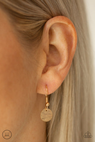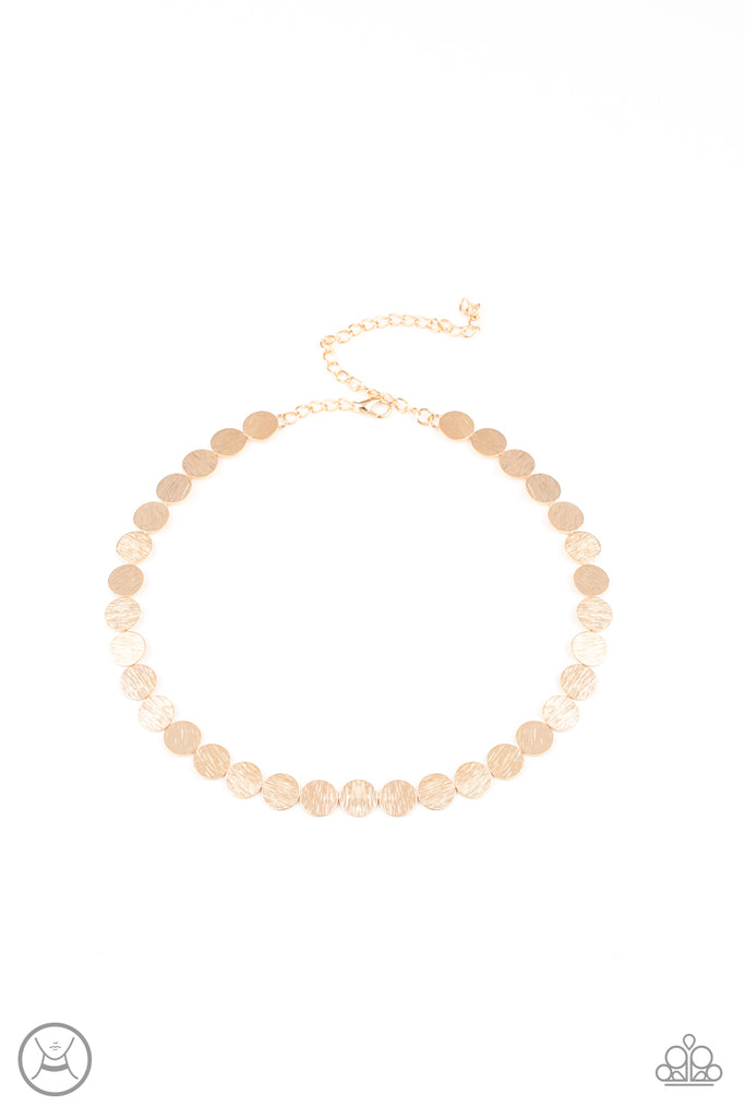 Delicately scratched in linear shimmer, dainty gold discs link around the neck for a blinding metallic look. Features an adjustable clasp closure.