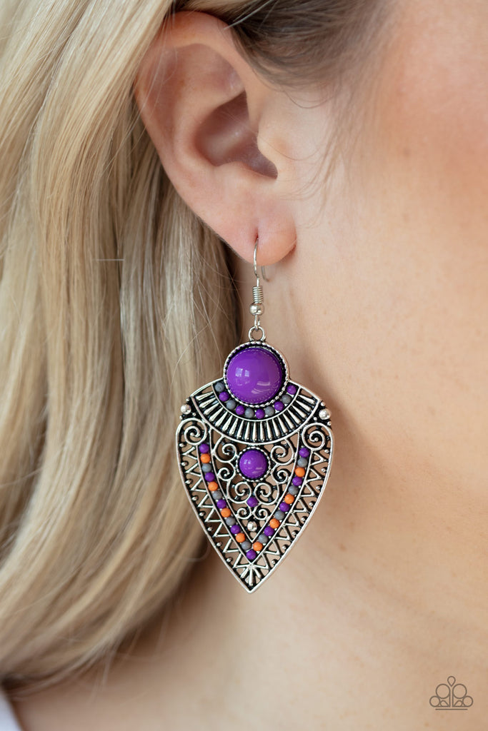 Purple, orange, and gray beads decorate the front of a spade shaped silver frame radiating with linear and zigzagging details for a tribal inspired look. Earring attaches to a standard fishhook fitting.